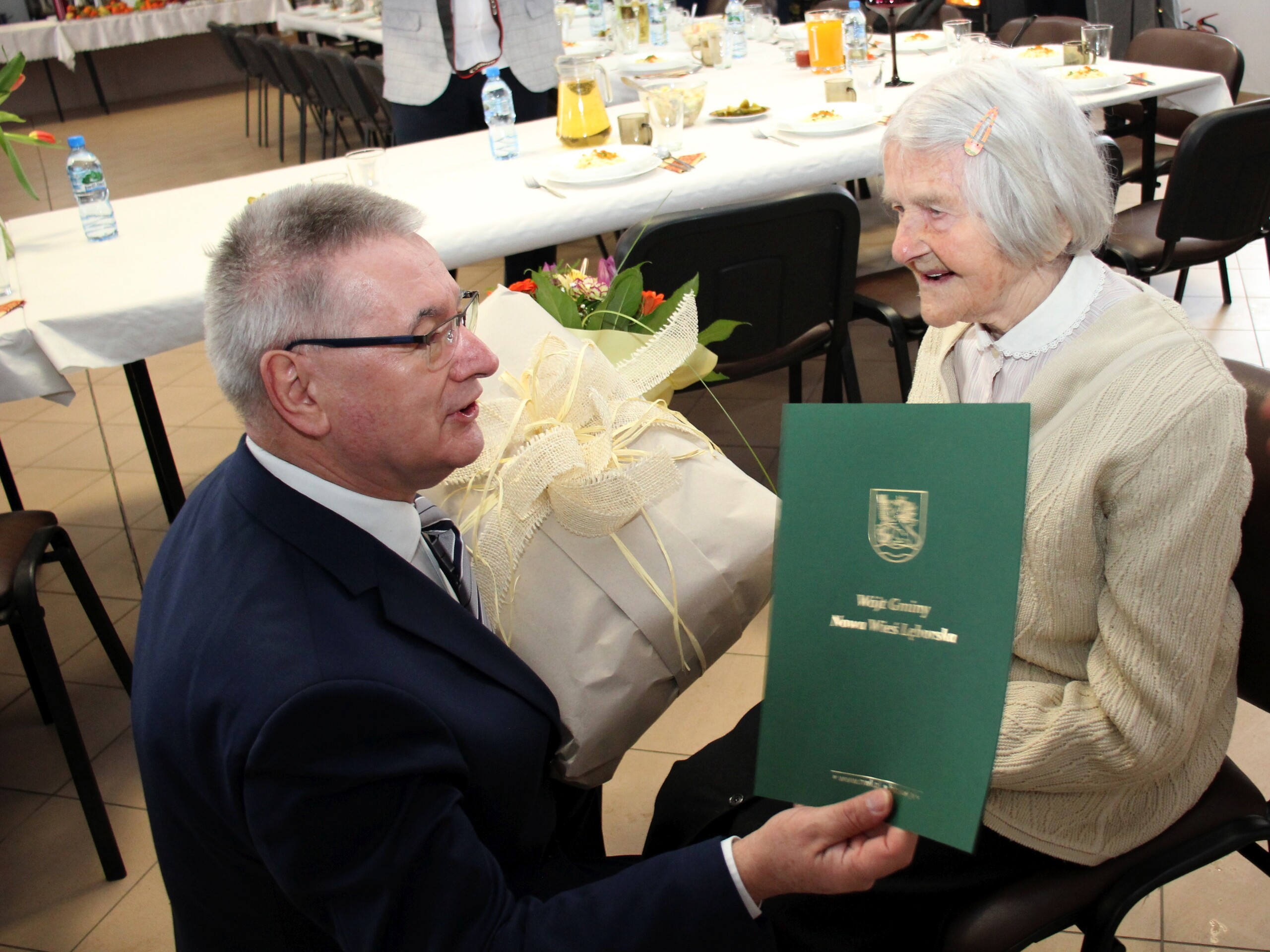 Z tej okazji Jubilatkę odwiedził Wójt Gminy Nowa Wieś Lęborska wraz z Kierownikiem Gminnego Ośrodka Pomocy Społecznej w Nowej Wsi Lęborskiej składając na jej ręce kwiaty, upominki oraz płynące z głębi serca serdeczne życzenia długich lat życia w zdrowiu i szczęściu, przepełnionych radością.