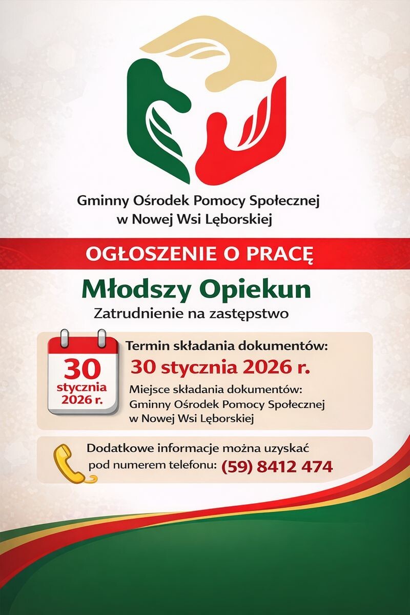- Wymagane dokumenty aplikacje należy składać w zamkniętych kopertach osobiście bądź pocztą na adres: Gminny Ośrodek Pomocy Społecznej w Nowej Wsi Lęborskiej ul. Młynarska 11, 84-351 Nowa Wieś Lęborska z dopiskiem „ Oferta na stanowisko młodszy opiekun”, do dnia 30 stycznia 2026 roku.