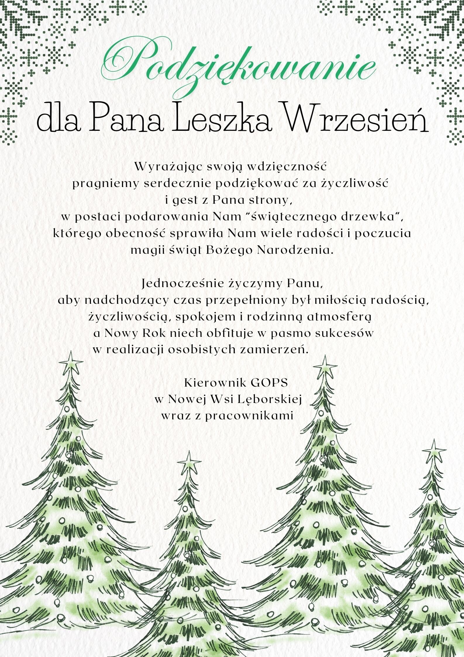 Wyrażając swoją wdzięczność pragniemy serdecznie podziękować Panu Leszkowi Wrzesień za życzliwość i gest w postaci podarowania Nam "świątecznego drzewka", którego obecność sprawiła wiele radości i magii Świąt Bożego Narodzenia.