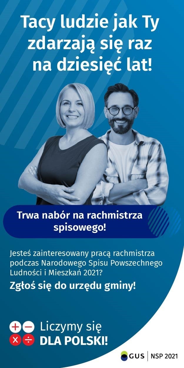 Informacja o uzupełniającym otwartym i konkurencyjnym naborze kandydatów na rachmistrzów spisowych wykonujących czynności w ramach prac spisowych, związanych z przeprowadzeniem na terytorium Rzeczpospolitej Polskiej w 2021 r. spisu powszechnego NSP 2021 r. Dokładne informacje w załącznikach zamieszczonych poniżej.