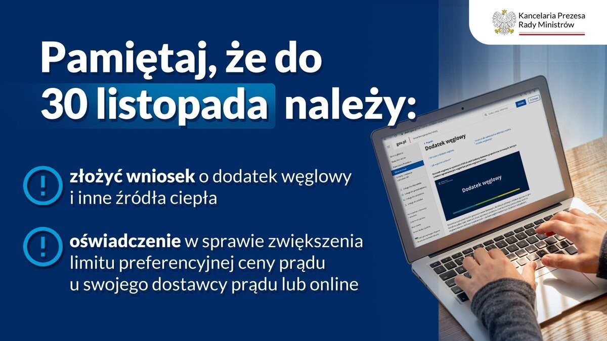 Szanowni mieszkańcy informujemy, że z dniem 30 listopada 2022 r. kończy się termin przyjmowania wniosków o dodatek węglowy oraz dodatek dla gospodarstw domowych. Wnioski złożone po tym terminie pozostawione zostaną bez rozpoznania.