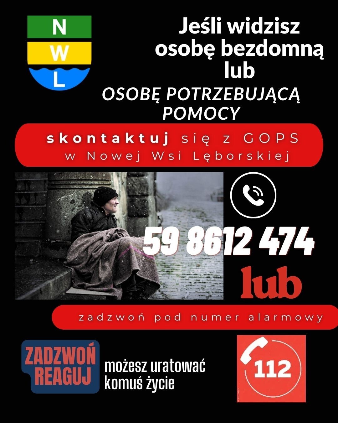 Jeżeli posiadają Państwo informacje, że na terenie gminy przebywają osoby bezdomne lub osoby potrzebujące pilnego wsparcia, prosimy o niezwłoczny kontakt: