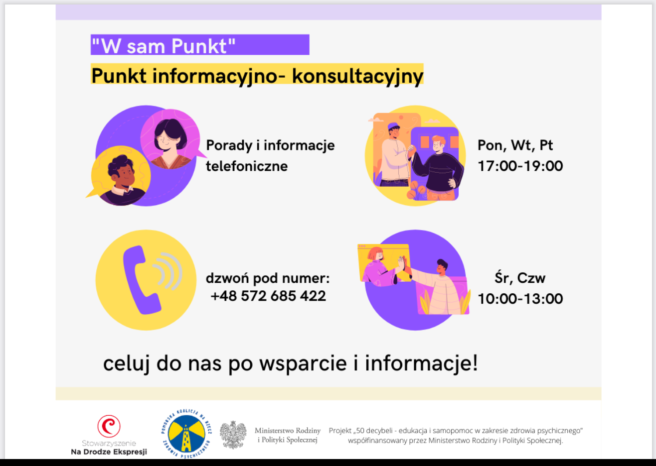 Konsultanci/konsultantki "W sam Punkt" pozostają do Waszej dyspozycji przez 5 dni w tygodniu pod numerem telefonu: +48 572 685 422. Kontakt jest wyłącznie telefoniczny.