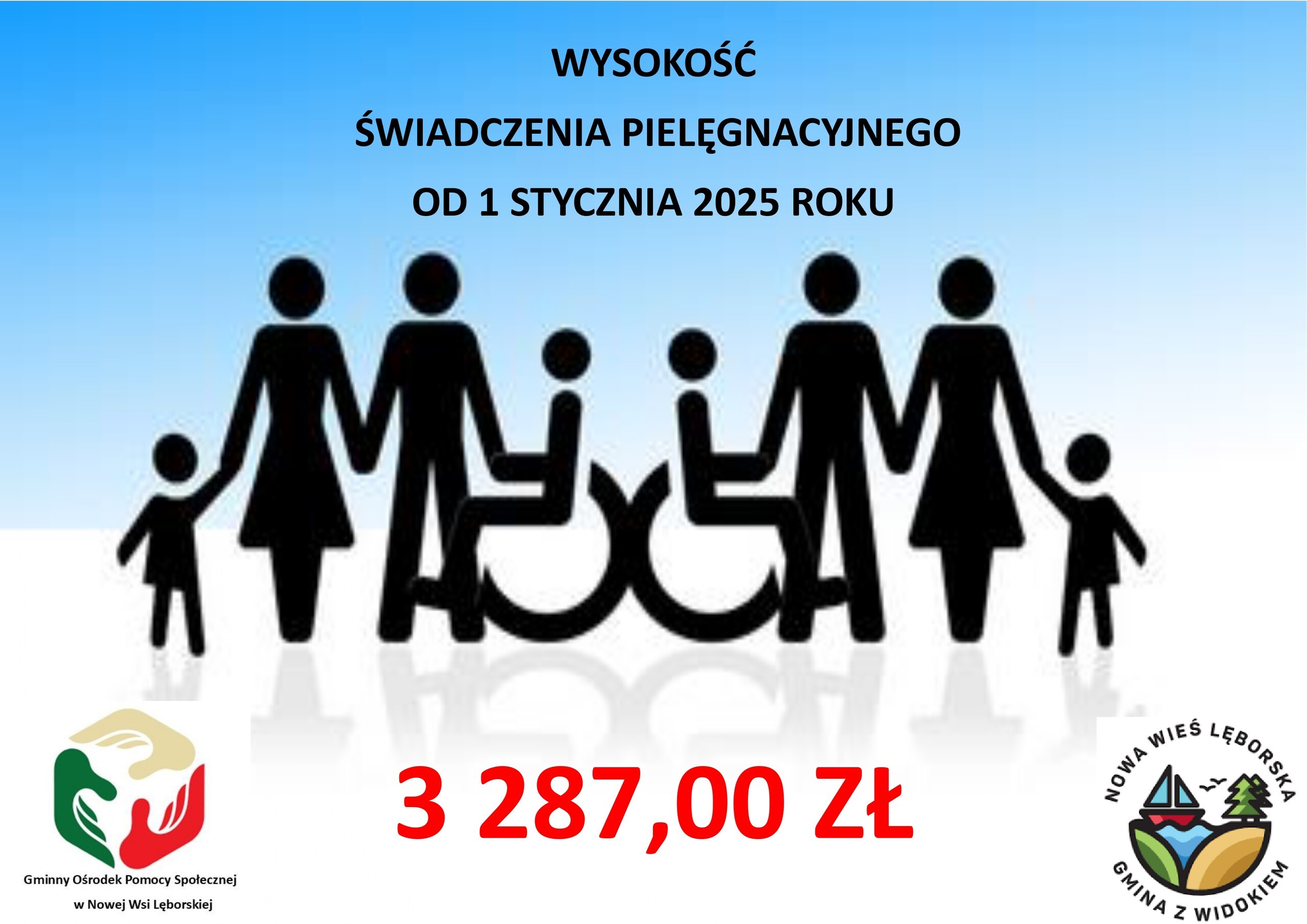 Gminny Ośrodek Pomocy Społecznej w Nowej Wsi Lęborskiej informuje, że zgodnie z Obwieszczeniem Ministra Rodziny, Pracy i Polityki Społecznej z dnia 6 listopada 2024 r. zmianie ulega kwota świadczenia pielęgnacyjnego, która od dnia 1 stycznia 2025 r. będzie wynosić 3.287,00 zł miesięcznie.